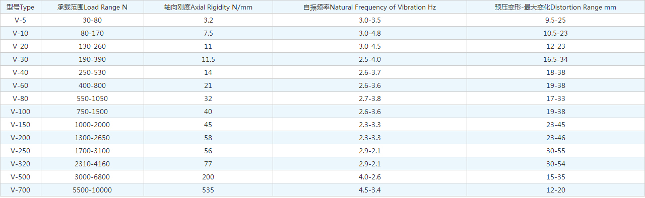 | 型號(hào) | 荷重范圍(Kg) | 彈性系數(shù)(Kg/mm) | 適用撓度(mm) |