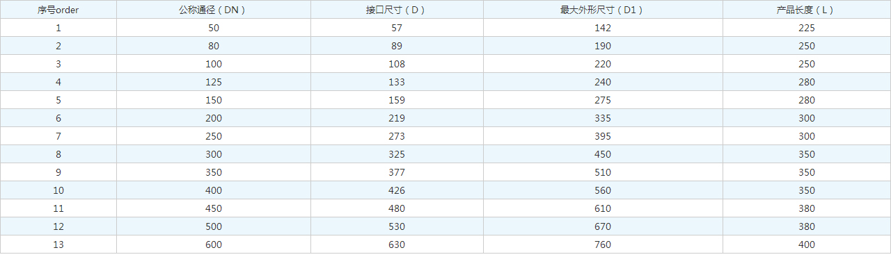 | 序號order | 公稱通徑(DN) | 接口尺寸(D) | 很大外形尺寸(D1) | 產(chǎn)品長度(L) |