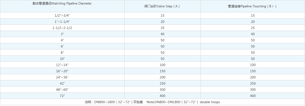 | 配合管道通徑Matching Pipeline Diameter | 閥門臺(tái)階Valve Step(A) | 管道連接Pipeline Touching(B>) |